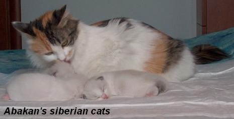 La madre Piuma Jamesova of Abakan che si prende cura dei suoi cuccioli di Siberian Cat.